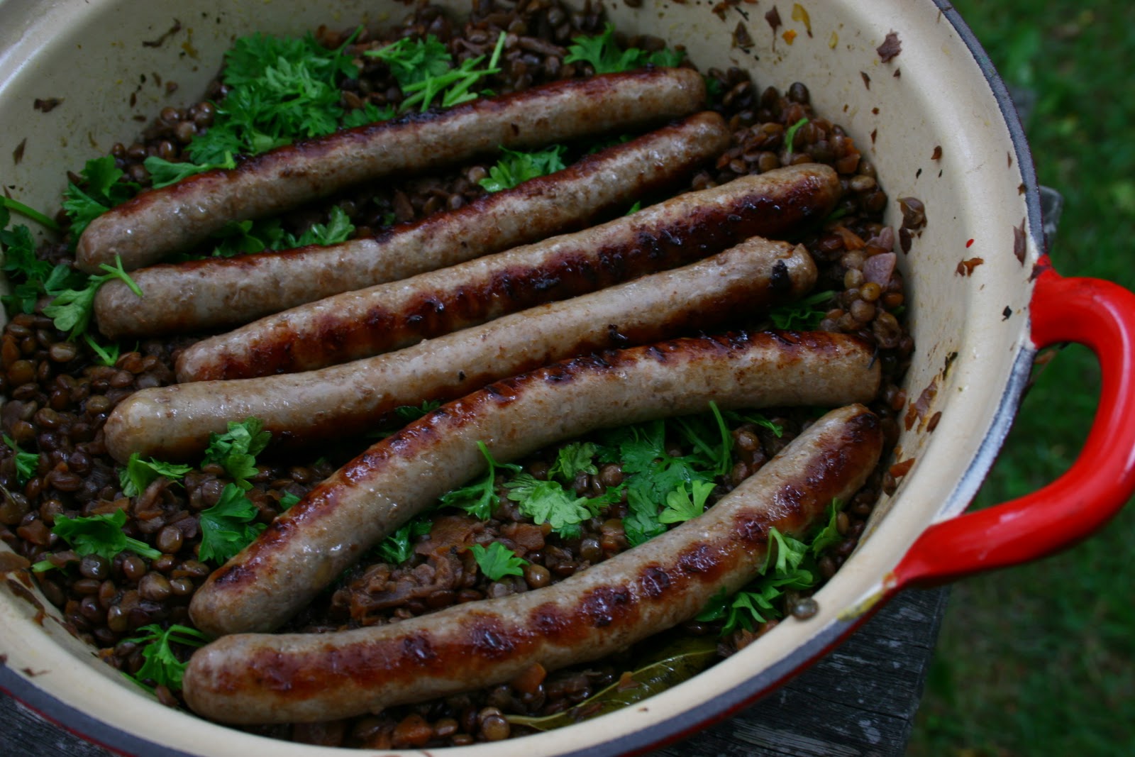 *Voor een vegetarische variatie: Gebruik gegrilde halloumi in plaats van de worstjes. Gril dikke plakken halloumi in 3-4 minuten goudbruin en serveer over de linzen.